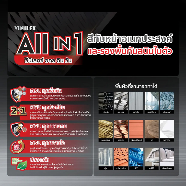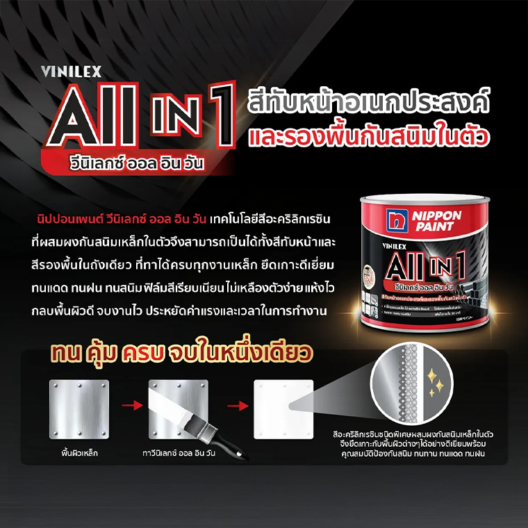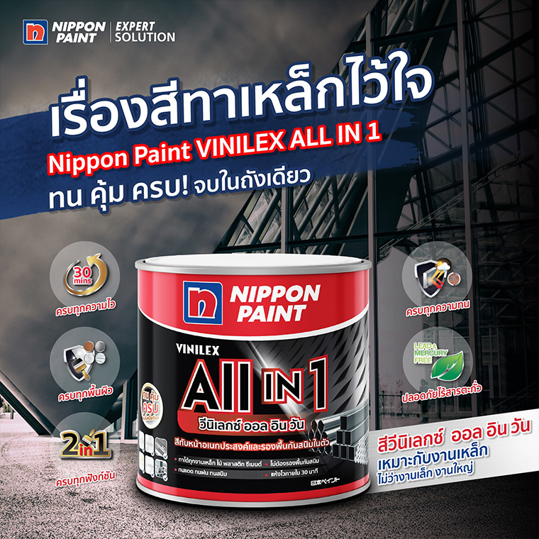 สีทาเหล็ก สีทาไม้ สีกันสนิม ทน คุ้ม ครบ จบในหนึ่งเดียว สีทับหน้าและรองพื้นกันสนิมในตัว นิปปอนเพนต์ วีนิเลกซ์ ออล อิน วัน (Vinilex All in 1) เป็นสีเคลือบอเนกประสงค์ ผลิตจากอะคริลิกเรซินชนิดพิเศษที่ผสมผงกันสนิมเหล็กในตัว จึงสามารถใช้ทาได้เลยโดยไม่ต้องใช้สีกันสนิมรองพื้น สามารถทาได้ครบทุกพื้นผิว เป็นได้ทั้งสีทาเหล็ก สีทากัลวาไนซ์ สีทาอะลูมิเนียม สีทาปูน สีทาไม้ สีทาพลาสติก พีวีซีเป็นต้น ทนทาน ทนสภาวะอากาศ ฟิล์มสีเรียบเนียน ไม่เหลืองตัวง่าย แห้งไว กลบพื้นผิวดีเยี่ยม เหมาะสำหรับงานภายนอกและภายใน จบงานไว ประหยัดค่าแรงและเวลาในการทำงาน